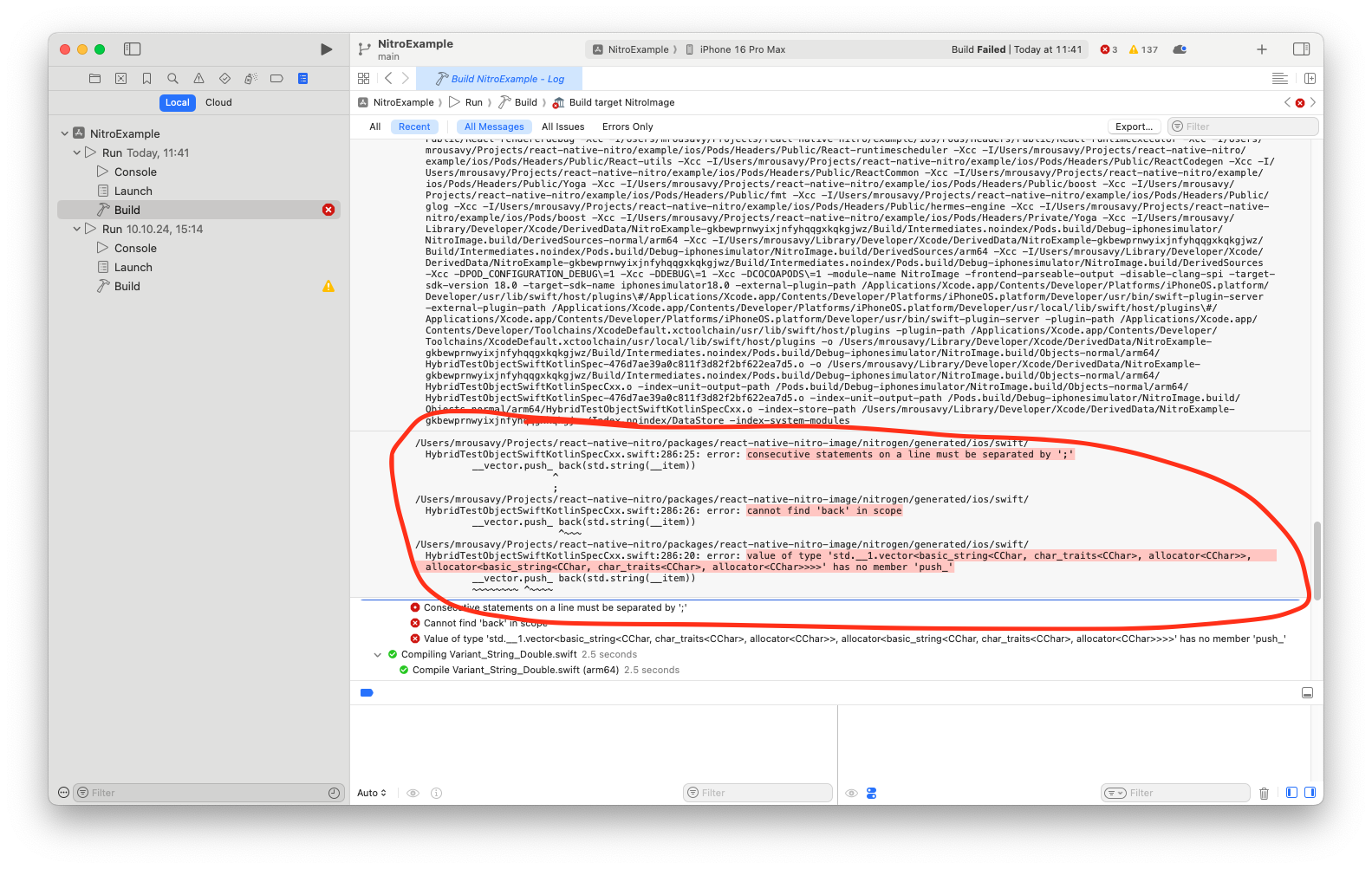 6. Copy those bottom logs only (not the build command invocation above) and create a GitHub issue with that.